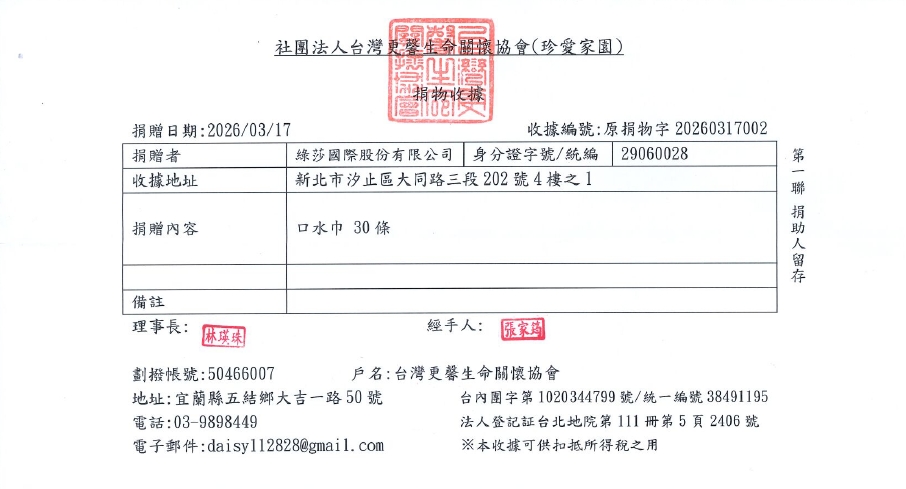 2026/03/17 格蕾莎公益活動~捐贈台灣更馨生命關懷協會(珍愛家園)30條嬰兒口水巾