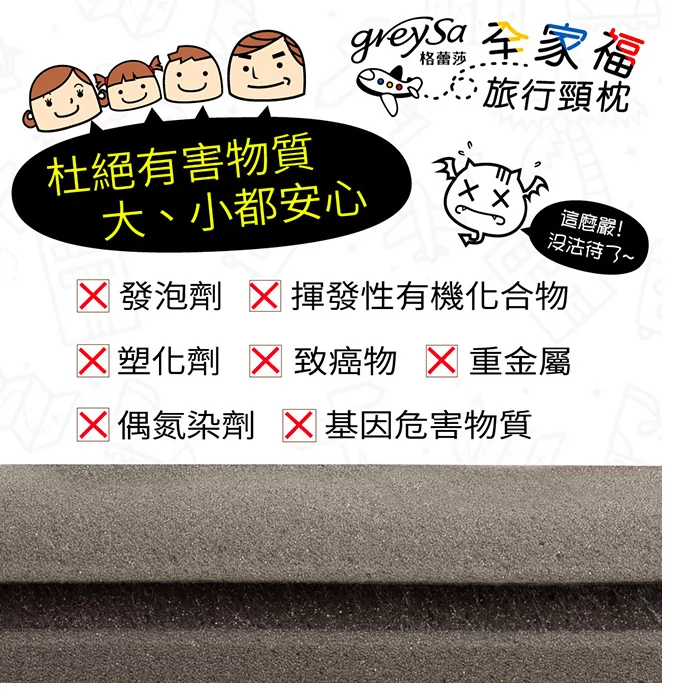 GreySa格蕾莎全家福旅行頸枕所採用的記憶泡綿,是採用德國國際大廠原料發泡而成,經過不斷研發與修正,可以改進以往記憶泡綿的缺點,擁有更良好的透氣性、支撐性、釋壓性並且不會因氣溫高低改變軟硬度,提供更舒適、更優質的寢具商品枕芯材料。