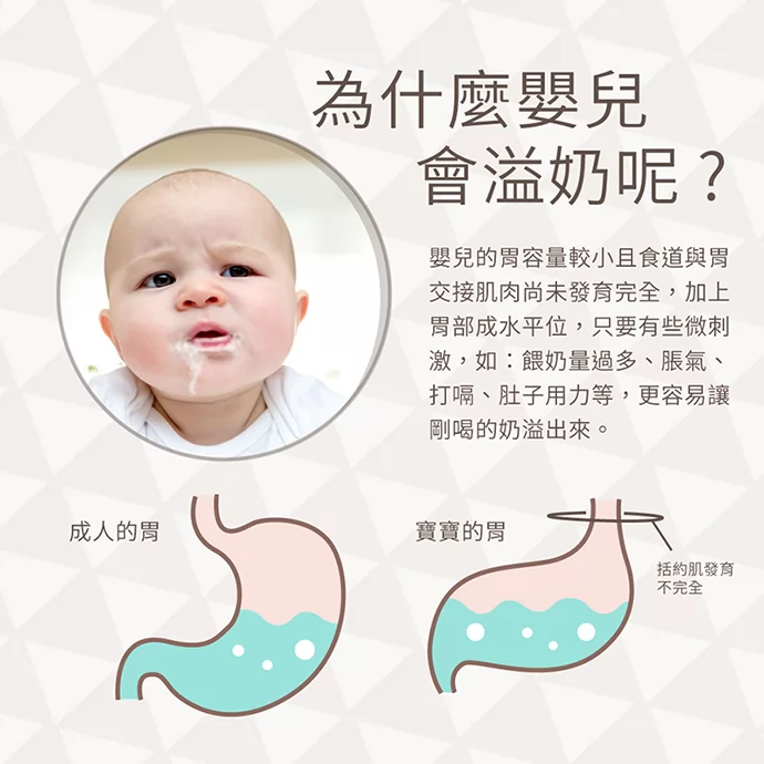 嬰兒的胃容量較小且食道與胃交接肌肉尚未發育完全,加上胃部成水平位,只要有些微刺激,如:餵奶量過多、脹氣、打嗝 、 肚子用力等,更容易讓剛喝的奶溢出來 。