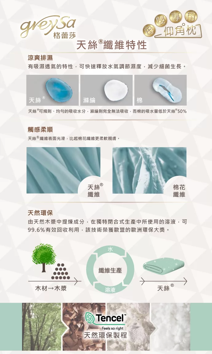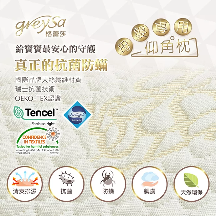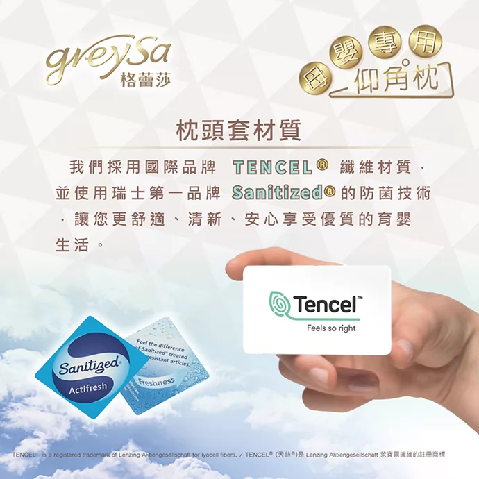 GreySa格蕾莎母嬰專用仰角枕的枕頭套,採用國際品牌TENCEL®天絲纖維材質,並使用瑞士第一品牌Sanitized®的防菌技術,讓您更舒適、清新、安心地享受優質的育嬰生活。