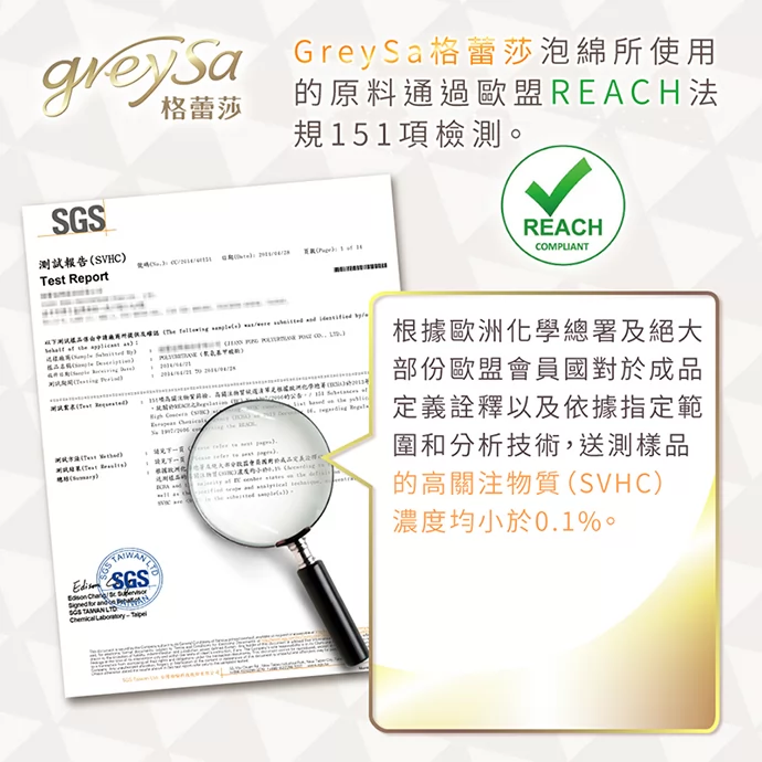 GreySa格蕾莎所使用的泡綿通過歐盟REACH法規151項檢測