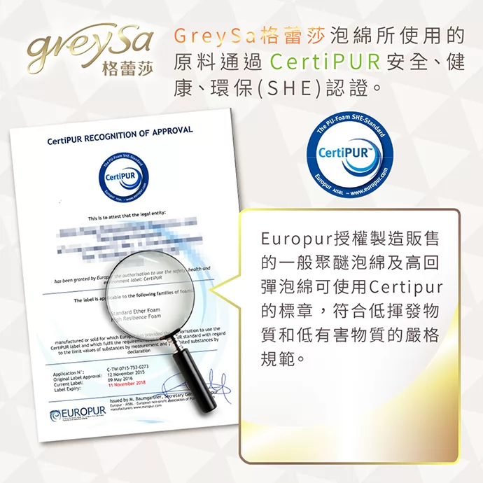 GreySa格蕾莎泡綿所使用的原料通過CeriPUR安全健康環保(SHE)認證