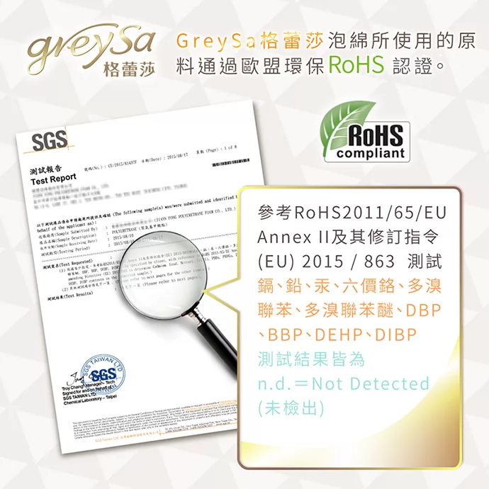 GreySa格蕾莎所使用的泡綿通過歐盟環保RoHS認證
