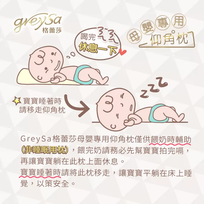 GreySa格蕾莎母嬰專用仰角枕僅供餵奶時輔助(非睡眠用枕),餵完奶請務必先幫寶寶拍完嗝,再讓寶寶躺在此枕上面休息。寶寶睡著時請將此枕移走,讓寶寶平躺在床上睡覺,以策安全。