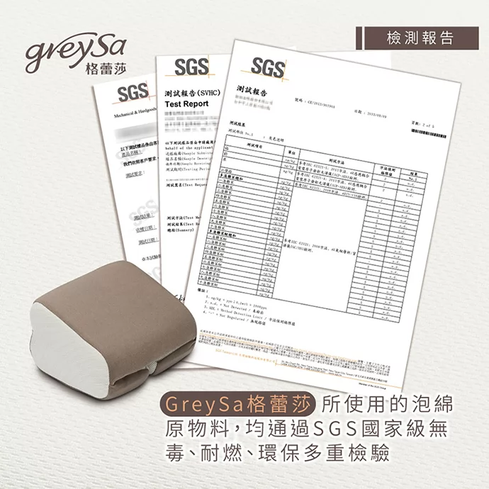 GreySa格蕾莎所使用的泡棉原物料,均通過SGS國家級無毒、耐燃、環保多重檢驗