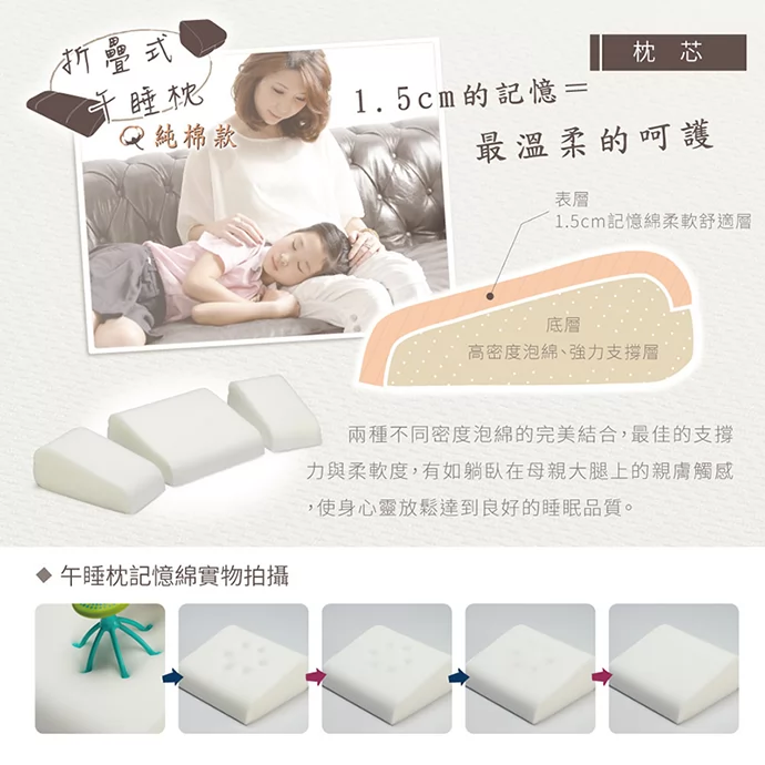 40支雙面純棉布與記憶綿的完美結合,營造出肌膚般的觸感,午睡時能夠放鬆地進入深層睡眠。