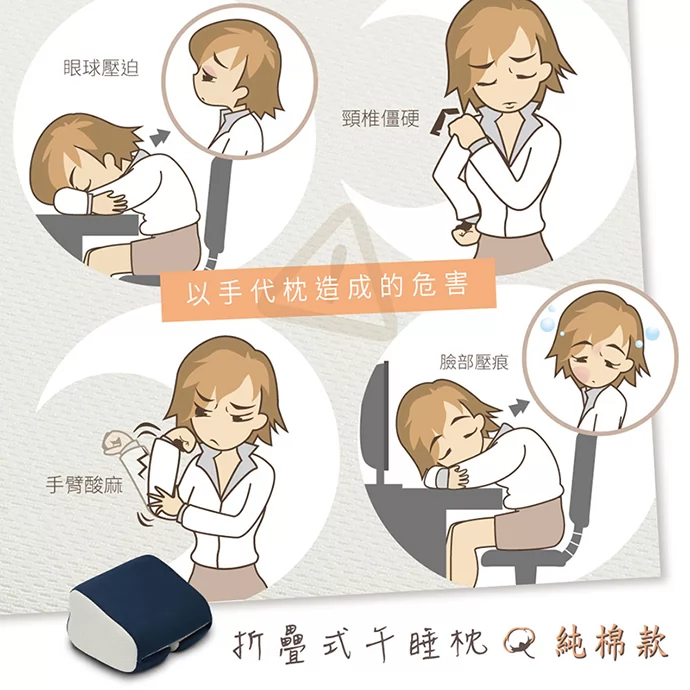十個上班族有八個為午睡問題所苦,依午睡習慣設計而成的GreySa格蕾莎折疊式午睡枕,可依個人體型及需求調整高度,軟硬適中不會使手臂及臉部受到壓迫而產生麻痺或局部泛紅,每天中午舒眠10分鐘,可以舒緩一整天的工作疲勞累積的精神不濟、思緒不集中,亦可當做辦公椅的腰背靠枕墊,既舒適實用又不佔空間!