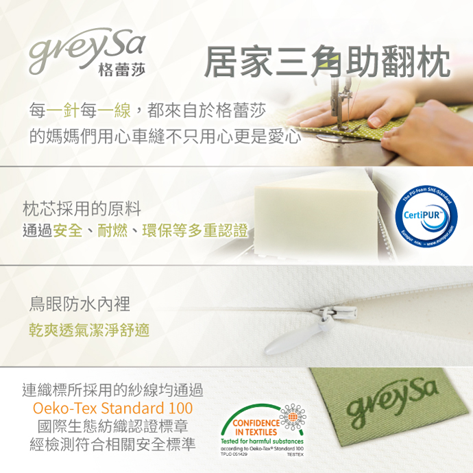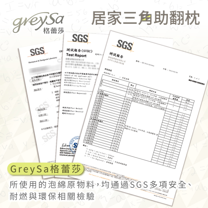 GreySa格蕾莎居家三角助翻枕所使用的泡綿原物料,均通過SGS多項安全、耐熱、環保相關檢驗