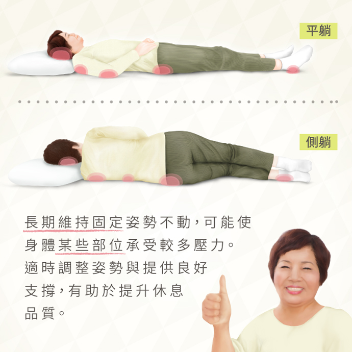 長期維持固定姿勢不動,可能使身體某些部位承受較多壓力。適時調整姿勢與提供良好支撐,有助於提升休息品質。