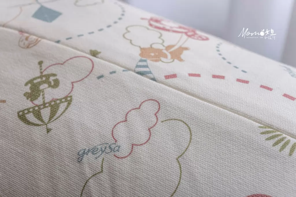 格蕾莎的對於產品的材質一向也都相當重視喔!這個成人側睡抱枕,採用布套是『純棉印花布套』摸起來相當舒服,我時常忍不住會用臉去躺在抱枕上呢!純棉印花布套的外層相當舒適外,它也有透氣性也不失保暖度喔!四季都非常適合使用!它的內層是綿綿密密的纖維毛圈,材質非常好啊!布料上除了有可愛的圖案之外,還有品牌的logo融入其中。圖樣的用色我也很喜歡,是帶有一點灰的色彩,是個很適合搭配各種家具的色系。