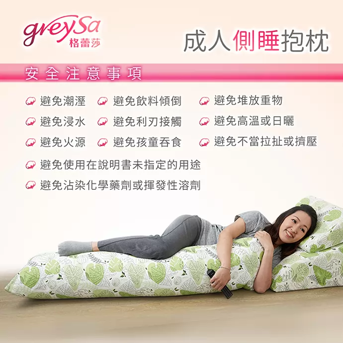 GreySa格蕾莎【成人側睡抱枕】安全注意事項:避免潮濕/避免浸水/避免火源/避免堆放重物/避免飲料傾倒/避免利刄接觸/避免高溫或日曬/避免不當拉扯或擠壓/避免使用在說明書未指定的用途/避免沾染化學藥劑或揮發性溶劑