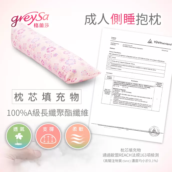 GreySa格蕾莎成人側睡抱枕的枕芯填充物採用100% A級長纖聚酯纖維