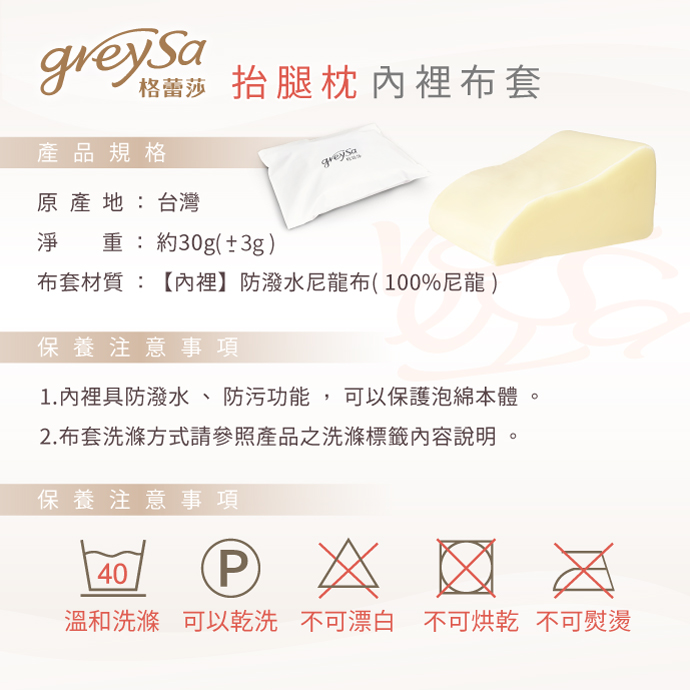 GreySa格蕾莎抬腿枕內裡布套產品規格: 原產地:台灣 淨重:約30g(正負3g) 布套材質: 【內裡】防潑水尼龍布(100%尼龍) 保養注意事項 1. 內裡具防潑水、防污功能,可以保護泡綿本體。 2. 布套洗滌方式請參照產品之洗滌標籤內容說明。 洗滌方式 內裡布套:溫和洗滌/可以乾洗/不可漂白/不可烘乾/不可熨燙