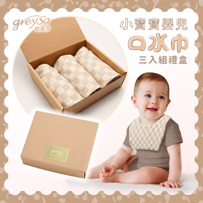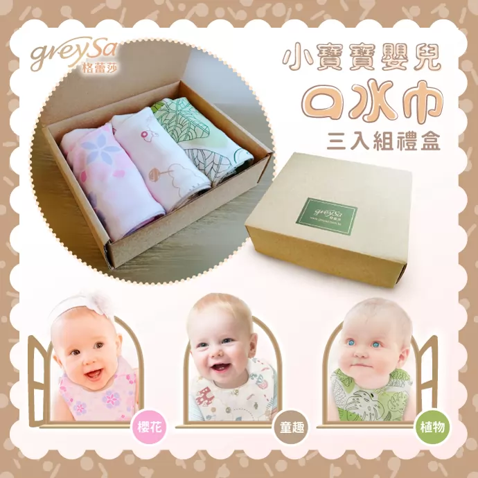 GreySa格蕾莎【小寶寶嬰兒口水巾三入組禮盒-童趣/櫻花/植物/棋盤】
