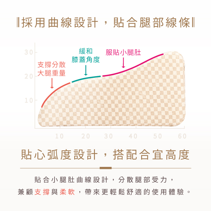 格蕾莎抬腿枕依人體腿部曲線設計,凡身高介於 155cm ~ 175cm 範圍的男女皆適用。