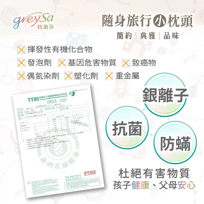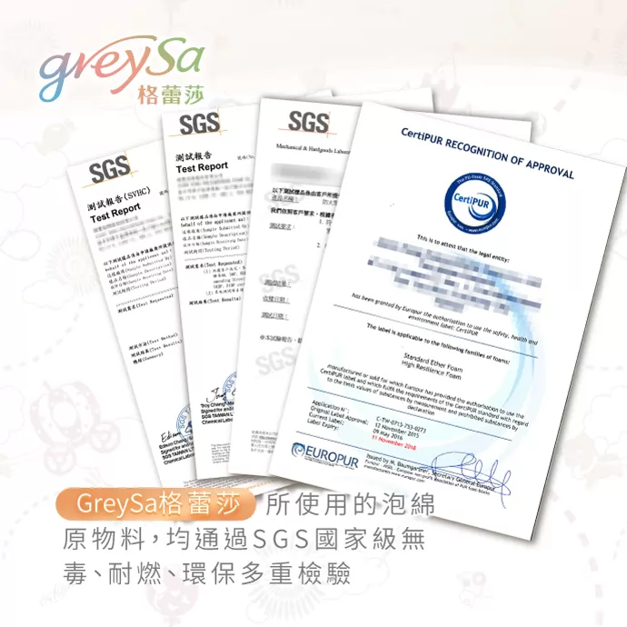 GreySa格蕾莎所使用的泡綿原物料,均通過SGS國家級無毒、耐熱、環保多重檢驗