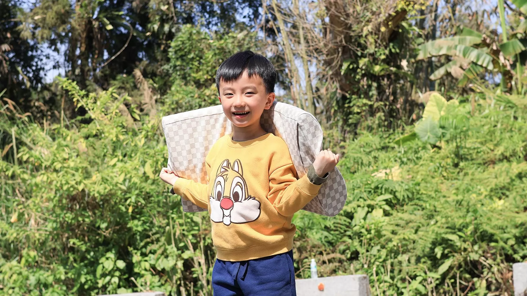 因為誠哥很愛他的新枕頭,所以特別讓他這次露營也帶出門,他超開心的啊。