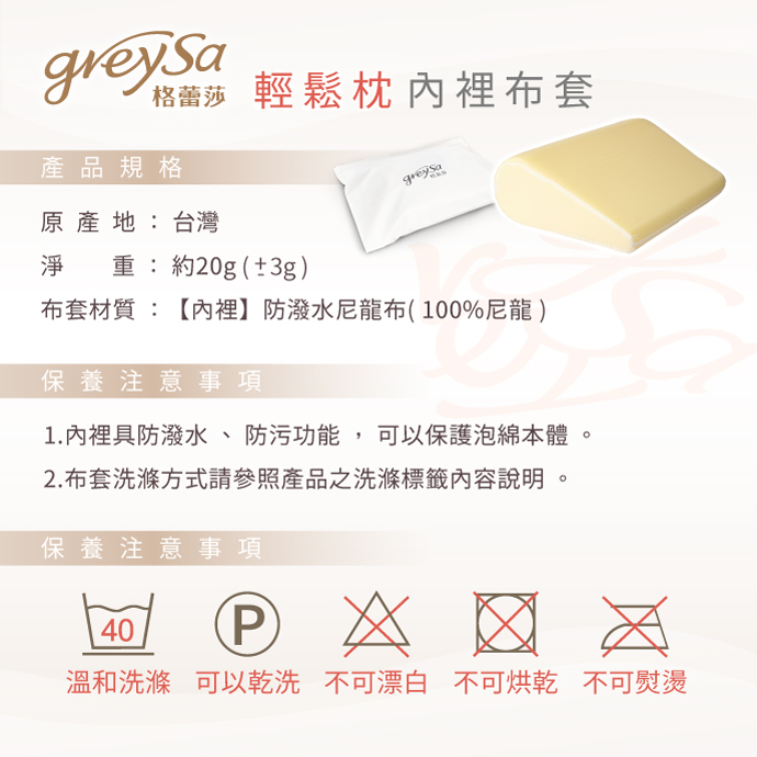 GreySa格蕾莎抬腿枕內裡布套產品規格: 原產地:台灣 淨重:約20g(正負3g) 布套材質: 【內裡】防潑水尼龍布(100%尼龍) 保養注意事項 1. 內裡具防潑水、防污功能,可以保護泡綿本體。 2. 布套洗滌方式請參照產品之洗滌標籤內容說明。 洗滌方式 內裡布套:溫和洗滌/可以乾洗/不可漂白/不可烘乾/不可熨燙