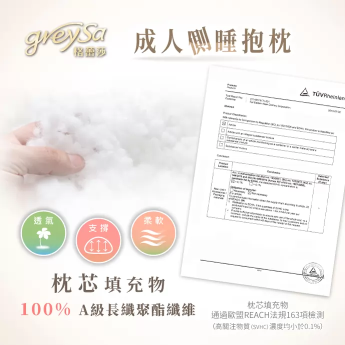 GreySa格蕾莎成人側睡抱枕的枕芯填充物採用100% A級長纖聚酯纖維