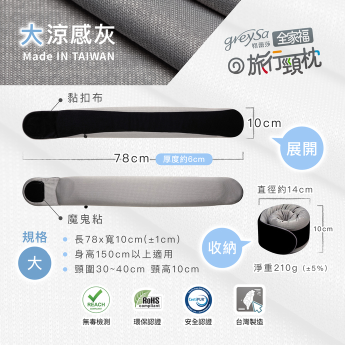 GreySa格蕾莎全家福旅行頸枕所採用的記憶泡綿,是採用德國國際大廠原料發泡而成,經過不斷研發與修正,可以改進以往記憶泡綿的缺點,擁有更良好的透氣性、支撐性、釋壓性並且不會因氣溫高低改變軟硬度,提供更舒適、更優質的寢具商品枕芯材料。