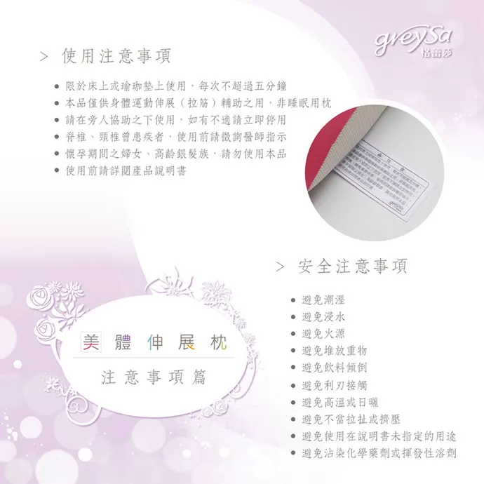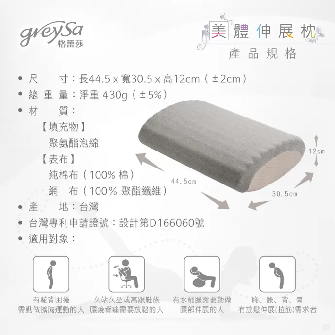 GreySa格蕾莎美體伸展枕適用對象:有水桶腰、駝背、肩頸酸(痠)痛、腰酸(痠)背痛困擾者,以及久站久坐工作者、高跟鞋族、低頭族等。