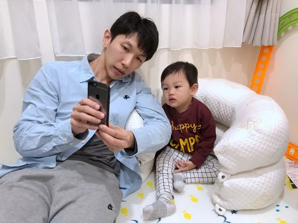 而把拔也常和芋泥在遊戲間靠著哺乳枕一起玩耍