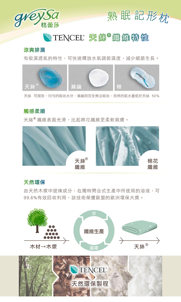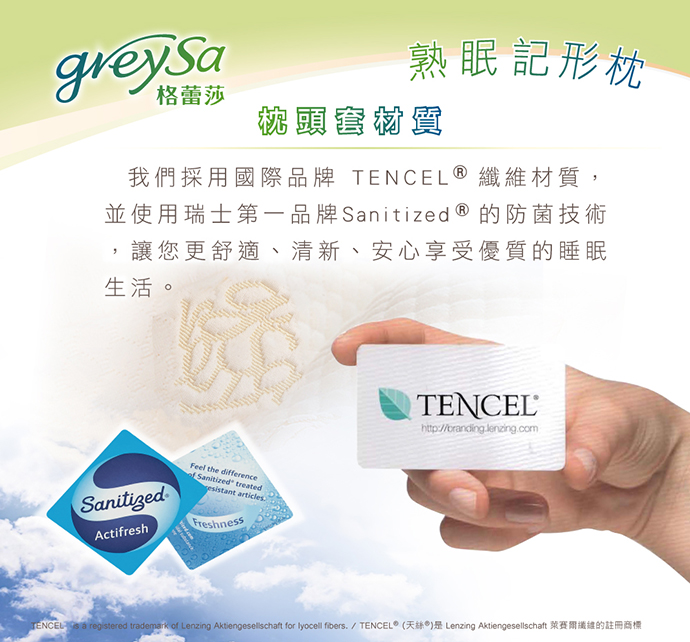 GreySa格蕾莎熟眠記形枕的枕頭套,採用國際品牌TENCEL®天絲纖維材質,並使用瑞士第一品牌Sanitized®的防菌技術,讓您更舒適、清新、安心地享受優質的睡眠生活。