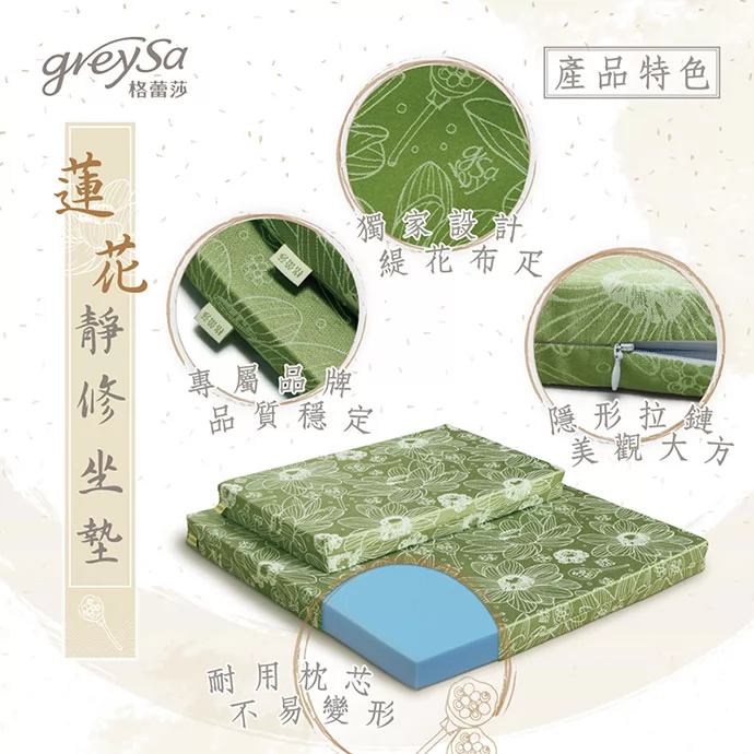 GreySa格蕾莎蓮花靜修坐墊組產品特色:獨家設計緹花布疋、專屬品牌品質穩定、隱形拉鏈美觀大方、耐用枕芯不易變形