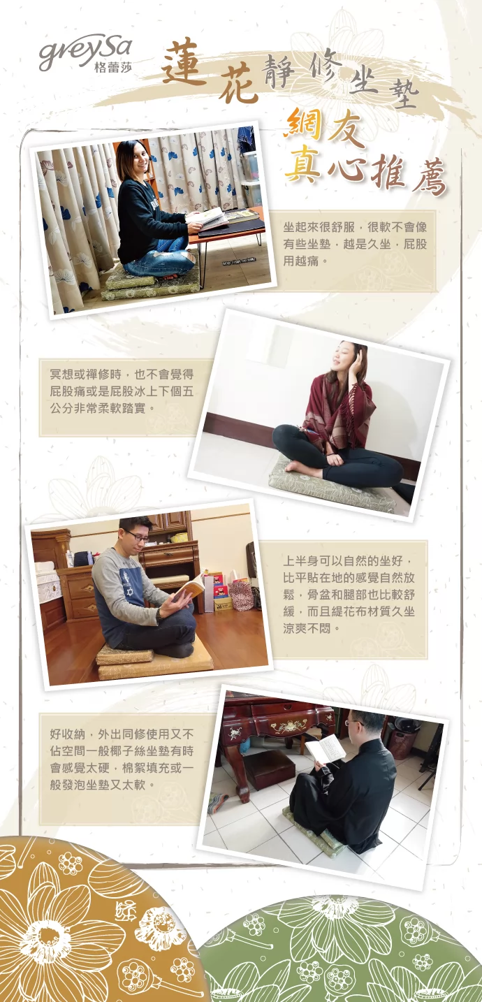 老公初次體驗,對「蓮花靜修坐墊組」讚譽有加,說以前在地板上坐久會酸痛,但坐在坐墊上面很舒適輕鬆,很能心無旁騖地靜坐很長的時間。