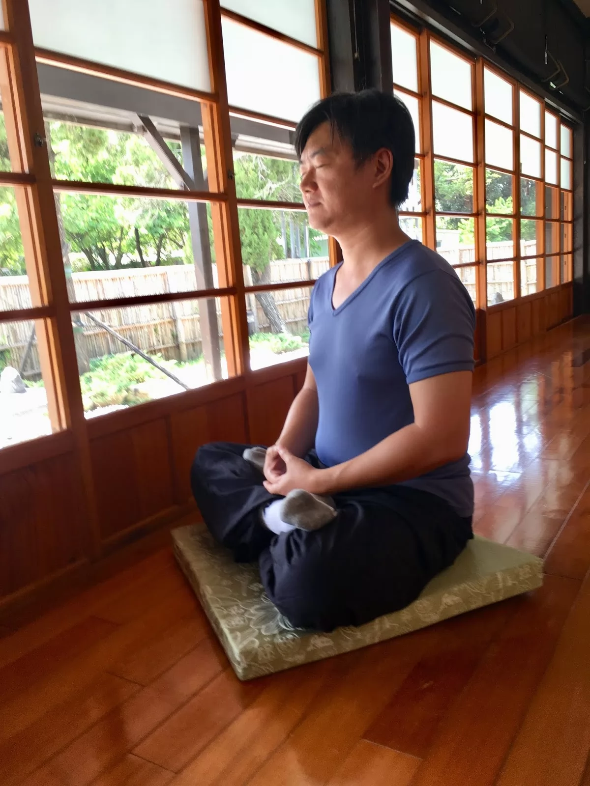 「靜坐」是顧名思義安靜坐著,坐姿可以「單盤膝」或「雙盤膝」來維持端正,心中無雜念,隨著呼吸自然起伏即可。近幾年來的研究證實可以促進身體健康和心情平和、提高專注力等,因為老公親身體驗到「靜坐」對身心靈有相當多的好處,使得老公相當投入。