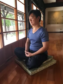 「靜坐」是顧名思義安靜坐著,坐姿可以「單盤膝」或「雙盤膝」來維持端正,心中無雜念,隨著呼吸自然起伏即可。近幾年來的研究證實可以促進身體健康和心情平和、提高專注力等,因為老公親身體驗到「靜坐」對身心靈有相當多的好處,使得老公相當投入。
