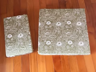 白色束口袋裡的坐墊組的顏色是「橄欖綠」,上面繡著美麗的蓮花,看起來是很典雅沈穩的款式。