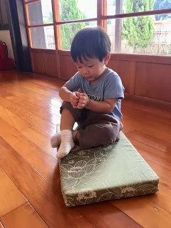 由於「雙盤膝」需要齊平的平面,老公僅使用大坐墊,小坐墊分給好奇的小福寶。