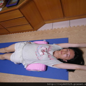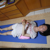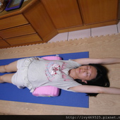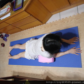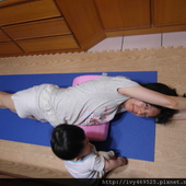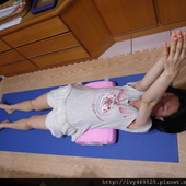 側面伸展,小朋友忽然跑來看媽媽作瑜珈XD 他對這嫩粉紅的墊子相當有興趣,左看看右瞧瞧!!彷彿也想一起做運動