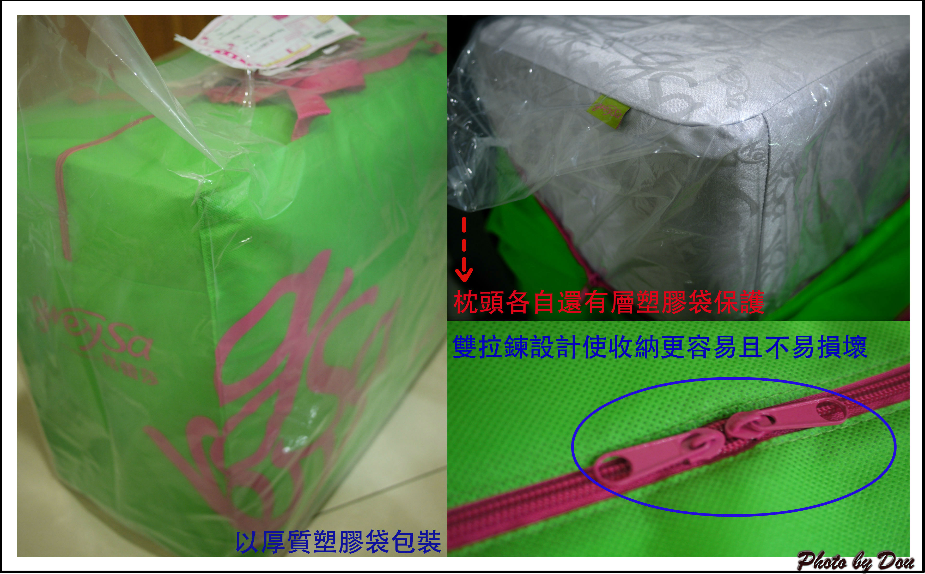 包裝的也太完整了吧!(抬腿枕+輕鬆枕不只有各自的包裝袋,整組還有防塵袋裝置且方便提取,防塵袋外面還有厚質塑膠袋保護著!)