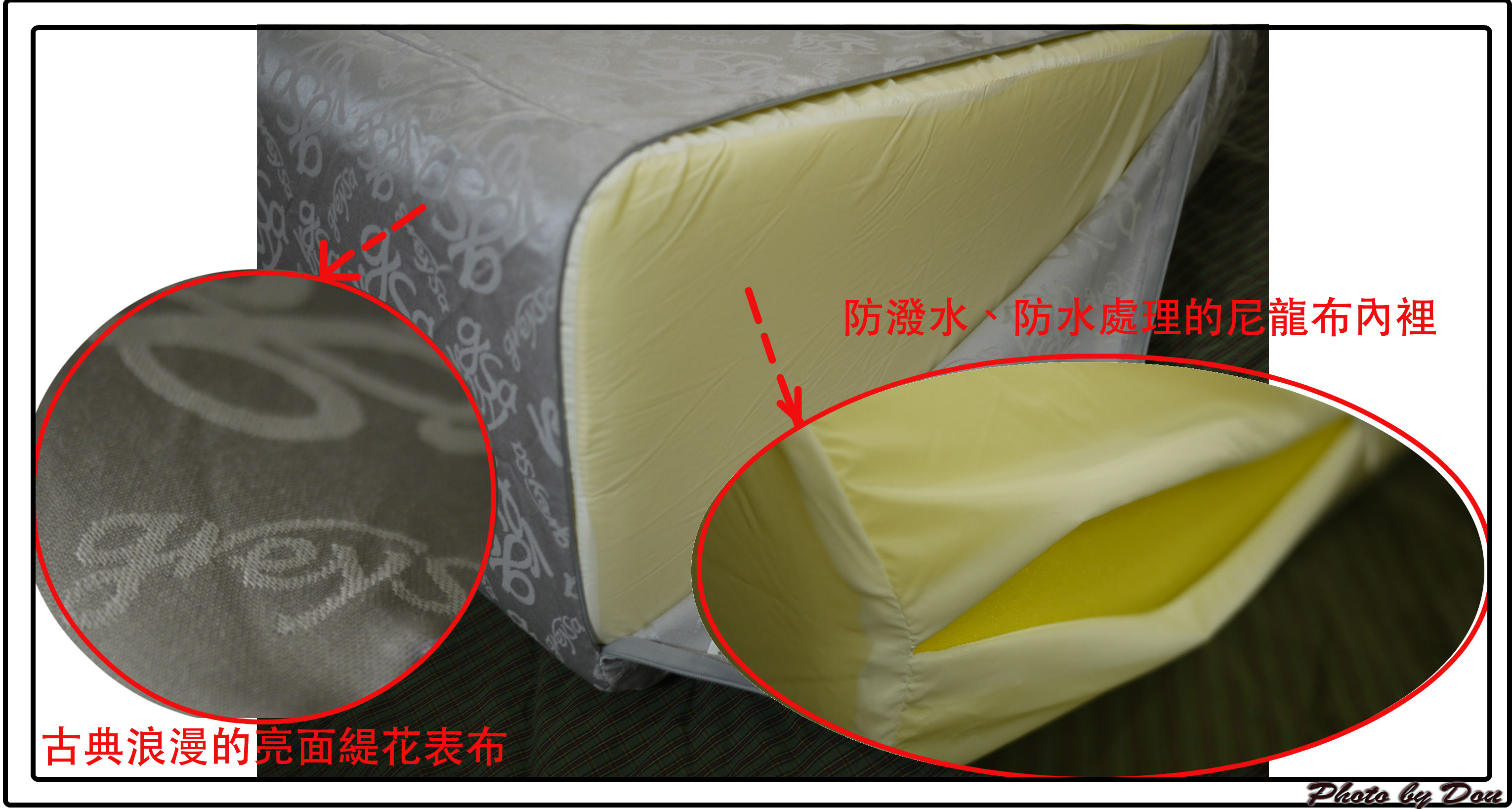 「亮點 1」—布套材質:古典浪漫的亮面緹花表布+防潑水、防水處理的尼龍布內裡