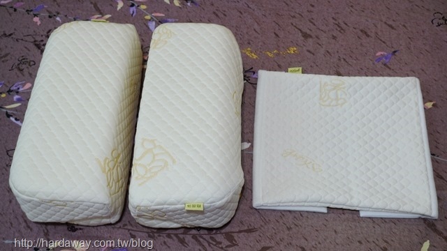 格蕾莎母子平安孕婦枕整個內容物,包括兩個可展開、收合,具有防翻枕與定位枕功能的枕頭,以及一條可用黏扣層接合這兩個枕頭的連接布。