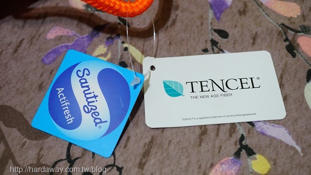 透明外袋提把上,會看到使用天絲纖維材質與Sanitized防菌技術的認證標籤。