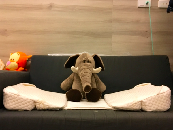 這時候就可以把兩個長方形枕頭固定,把寶寶放在中間,就可以安心去做自己的事情囉!