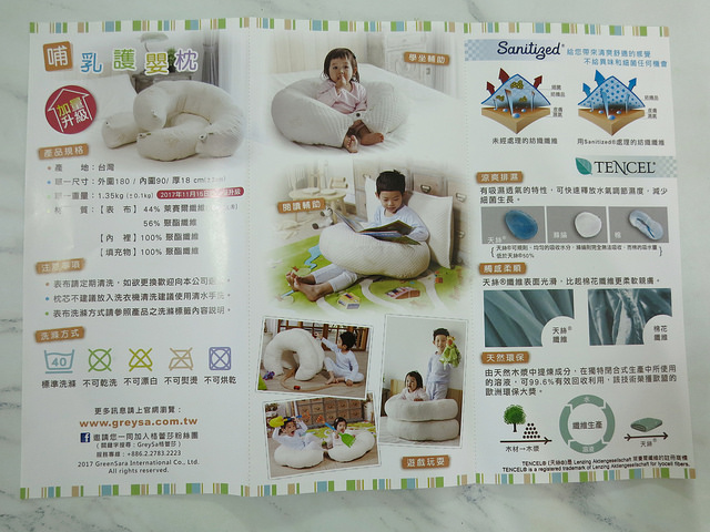 芒果妹妹的皮膚跟我一樣比較敏感,對於會和皮膚長時間接觸的衣物寢具類,我都盡量替她挑選成分比較單純的用品,格蕾莎的這一款哺乳護嬰枕就相當不錯。除了材質好之外,功能也相當實用,特別是拯救了我的手,第一胎照顧小燒賣時我花了好多錢買痠痛藥布喔QQ