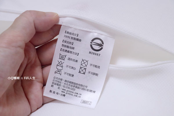 鳥眼布套背面有隱藏式拉鍊,布套本身的洗標縫製在布套內側。枕頭本身不能下水,但布套髒了是可以洗的。