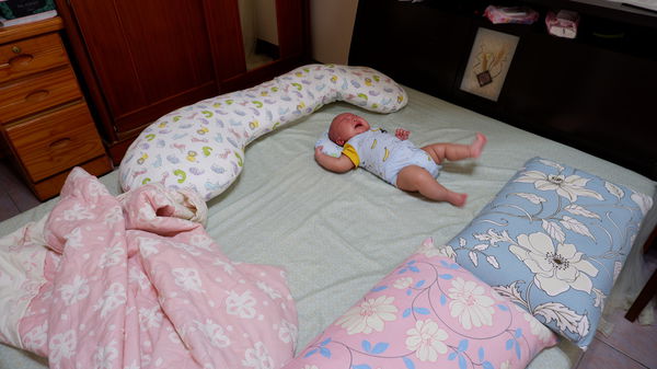 後來玩累了還直接倒在哺乳枕上睡著了....阿木我連哄睡都不用,超棒啊!
