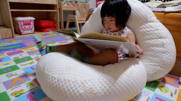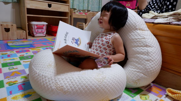 小公主很喜歡這樣坐在兩個哺乳枕中間看書,一個當靠墊一個當書桌,剛剛好~