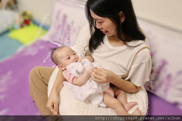 因為比妹是屬於比較容易溢吐奶的寶寶,所以我們平常都習慣餵完奶後讓她在哺乳護嬰枕上維持一定的高度斜躺一下來減緩吐奶狀況,也可以順便和她互動講講話;重點是每次我們家比妹躺上去整個就很放鬆的放空起來,完全變成嫩嬰專屬的放空枕呀!
