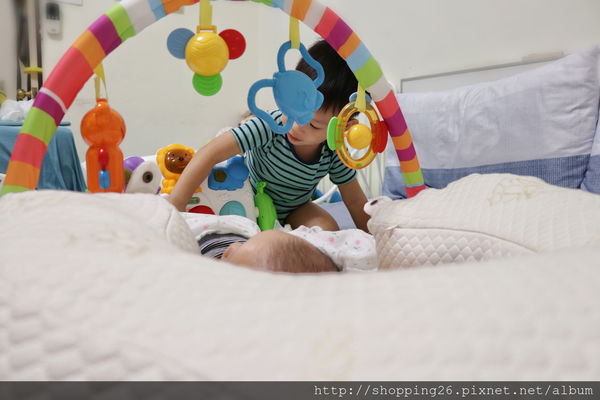 有兩個寶寶的媽媽一定都知道,當嫩嬰躺在床上的時候,大寶也很愛來湊熱鬧刷一下存在感,搞的太太無時無刻都很緊張很怕柯比哥過度的愛會傷到比妹,常常都在吶喊來人啊誰來把他帶走.