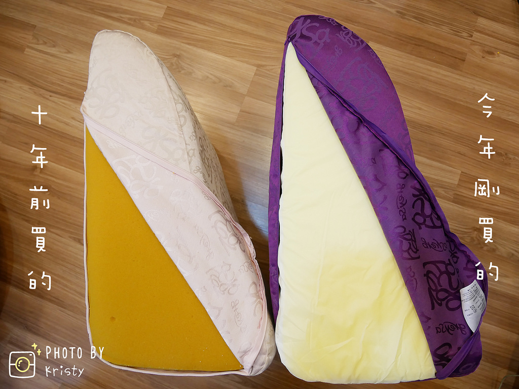 我姐這位抬腿枕前輩,因為小屁孩很愛在上面亂跳,已經過這麼多年有點泛黃,不過!!!海綿卻完全沒有變形塌陷,打開拉鍊也沒有碎掉跑出小屑屑(有一些海綿是會整個散開的你們知道吧)