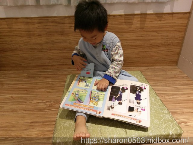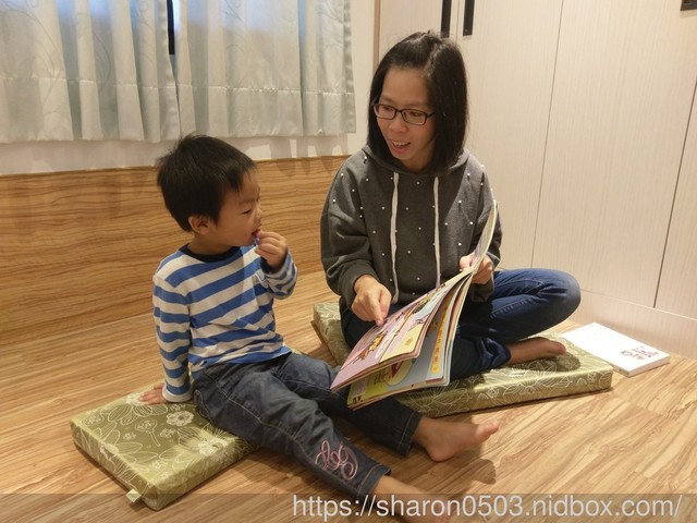 小孩很開心的在坐墊上看書,因為屁服不會庝