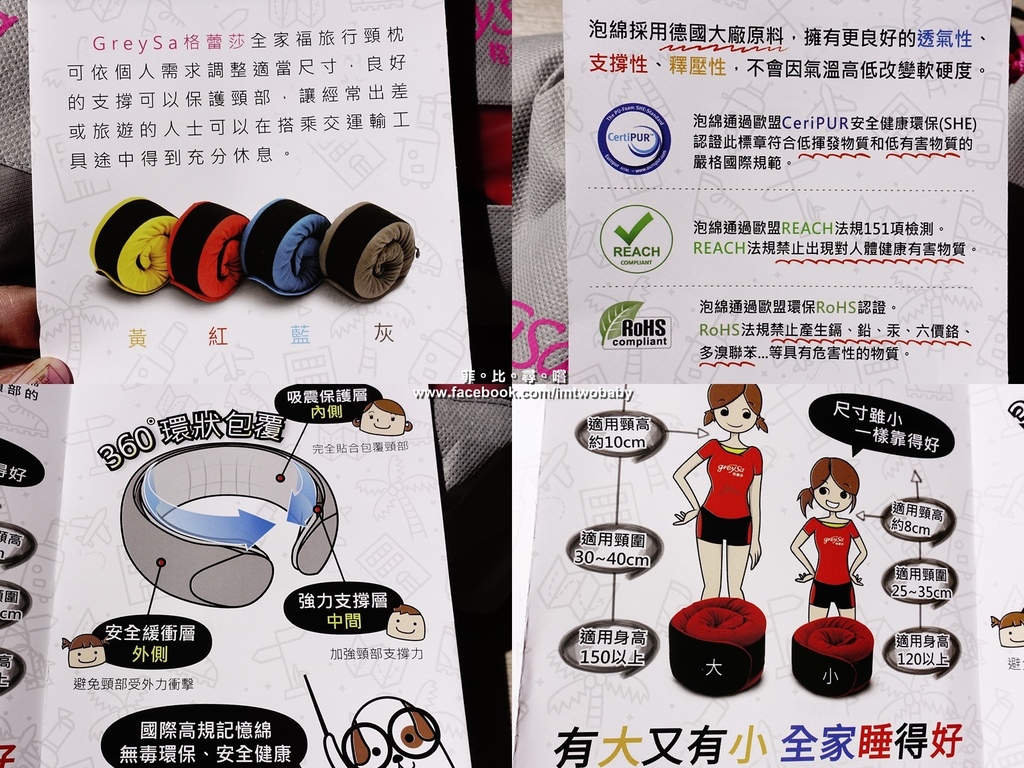 GreySa格蕾莎全家福旅行頸枕,泡綿是採用德國大廠原料,皆通過歐盟環保RoHS認證、歐盟REACH法規151項檢測,符合低揮發物質和低有害物質的嚴格國際規範~