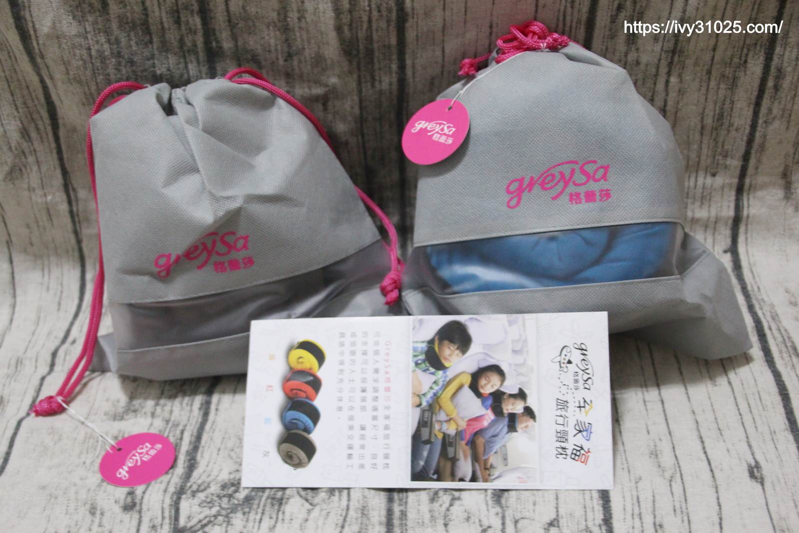 greysa格蕾莎 | 全家福旅行枕頭 的 收納 袋不僅印上 greysa格蕾莎 的logo標示,也有掛著專屬吊牌。