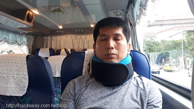 戴著GreySa格蕾莎全家福旅行頸枕在客運上補眠時,由於這個頸枕能透過大面積嬰兒用品級魔鬼粘調整鬆緊度,藉此把自己脖子360度完整包覆住,也能托住自己下巴,同時也填補椅背與頸部的間隙,而且在支撐之外,兼顧配戴舒適度的這個頸枕,我戴著長時間補眠,也不會有不舒服的情況發生。